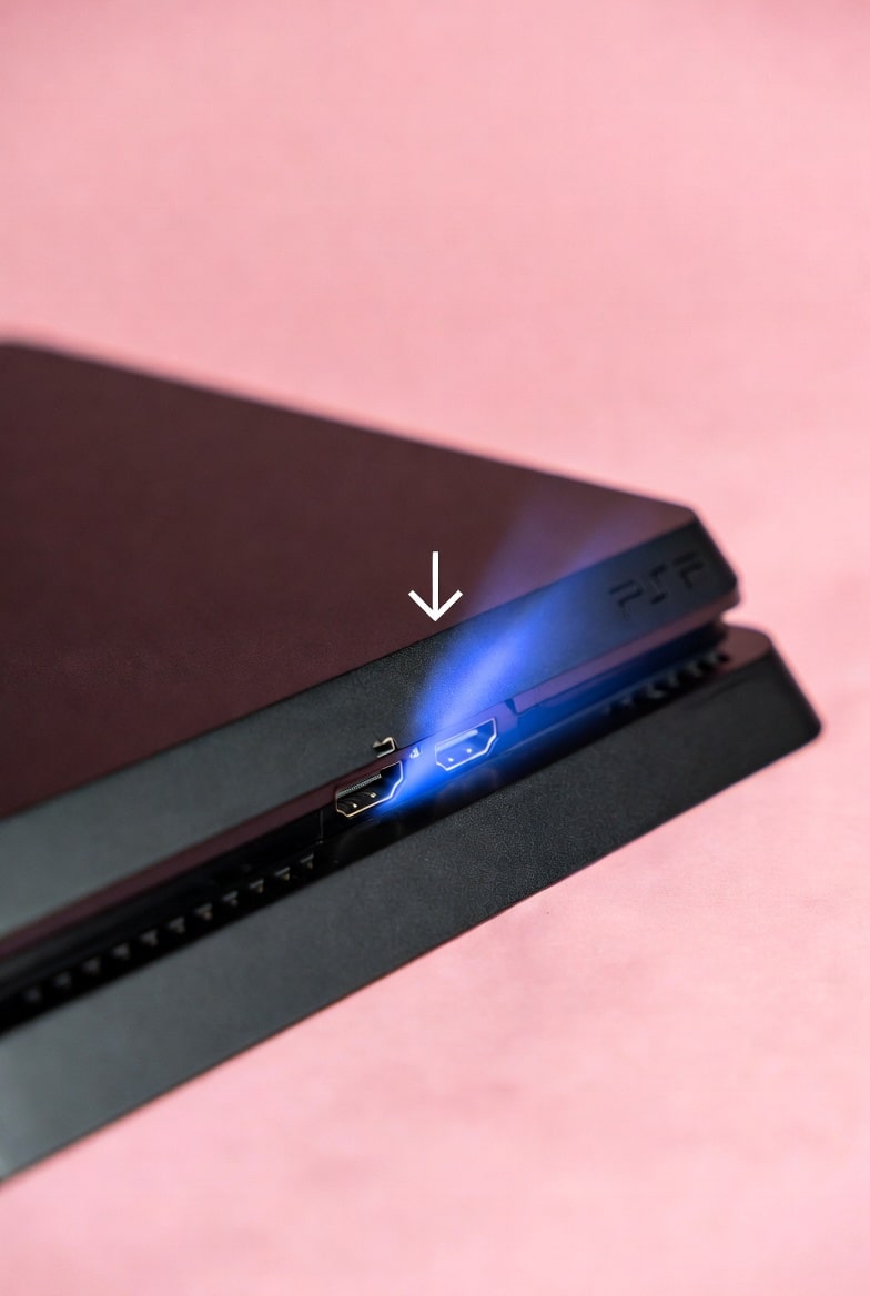 A high-resolution 1:1 technical shot focusing on the rear display interface of a PlayStation 4 console, positioned on a solid light pink studio background. The image highlights the HDMI port, representing the specialist micro-soldering and logic board hardware repair services available at the Atlantis workshop.