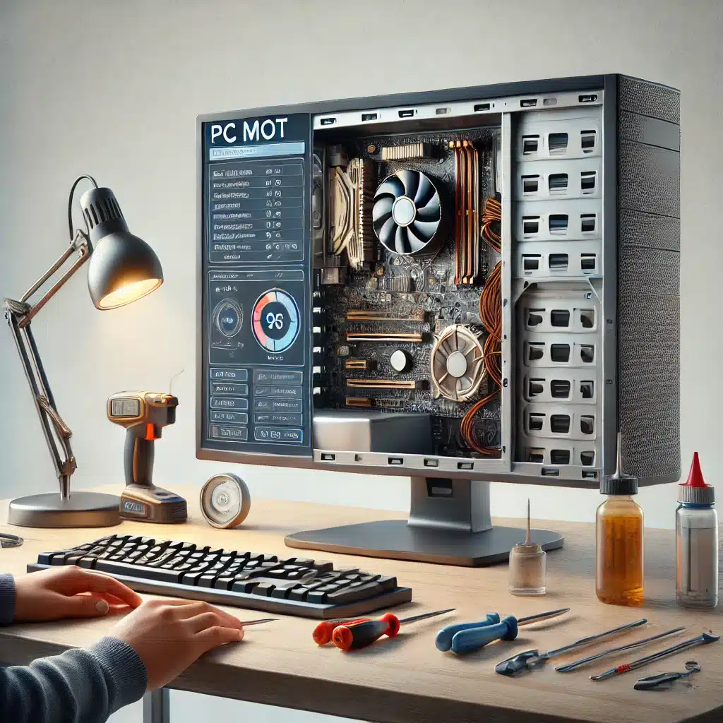 A realistic photo representing a PC MOT (Maintenance and Optimization Test). The image features a desktop PC on a workbench or table with tools